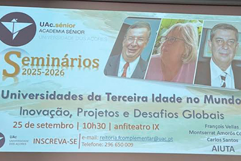 À l’initiative du professeur Carlos Santos, président de l’ORT Açores, François Vellas, président de la Aiuta et Montserrat Moros, secrétaire général de l’AIUTA et Vitor Ambrosio, Professeur à l'Institut du Tourisme d'Estoril ont participé au séminaire international organisé à l’université du troisième Age, de l’université des Açores à Ponta Delgada sur l’enseignement tout au long de la vie et l’intégration des seniors dans la vie Etudiante le jeudi 25 septembre 2025. Carlos Santos également secrétaire général, adjoint de l’Aiuta a proposé d’intégrer les universités du troisième âge dans les enquêtes conduite à partir des Açores, dans les pays Europe et d’autres continents sur les profils des étudiants seniors et leurs desiderata, notamment en matière d’éducation de transport internationaux et de voyage. Les premiers résultats de cette enquête seront présentés par Carlos, Santos à l’occasion de la conférence internationale et du conseil d’administration de l’AIUTA à Prague, les 13 et 17 octobre 2025.