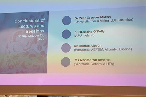 O Seminário Científico Internacional de Calonge sobre “A nova longevidade: desafios e oportunidades”, organizado pelo Campus da Experiência da Universidade Internacional da Catalunha em cooperação com a EFOS e a AIUTA, terminou na sexta-feira, 25 de outubro, com a apresentação das conclusões por Pilar Escuder Mollon (Universidade de Castellon), Christine O’Kelly (AFU Irlanda), Marain Alesson (Presidente da AEPUM, Universidade de Alicante) e Montserrat Amoros (Secretária-Geral da AIUTA). As conclusões mostraram novos caminhos de cooperação entre universidades da terceira idade e compararam experiências pedagógicas e organizacionais, especialmente com a integração de novas tecnologias. A AIUTA participará na divulgação destes importantes resultados em colaboração com a EFOS e a AEPUM.